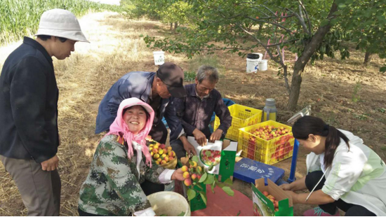图:傍晚红梅杏子园作业 7月4号当010植物生命营养液喷洒四次之后,农民朋友兴奋地发来喜报,通报使用010植物生命营养液的果树“黄叶少了、没了;叶面肥厚、油绿、光泽;挂果颜色鲜艳、均匀、增大”和未使用的“区别明显”,纷纷点赞“010营养液就是好”,表示“才这么几次,就看出效果了,明年一定在全县、全程使用,产出全国最好的果子”(农户亲口所言)。自己动手把010食品安全标准和010生命庄园立在他们的园区,并且上报到乡、县。故此彭阳县决定要把这第一批经过上海云士科技帮助提升的红梅杏送到上海,举办红梅杏杏子节,让彭阳地标性产品红梅杏,代表彭阳县回报上海,让上海人民品尝这“好吃到尖叫”的杏子。 令人意外的是,在确立了010生命农业科技的有效性后,农民积极性非常高,他们竟然自发地给自己的苹果园树立了这样的牌子“010安全矮砧苹果园”。他们借此表达他们的认同,认为010安全食品标准以及背后的科技正是他们所寻找的——更符合中国国情的安全食品标准。他们期望010可以帮助他们致富。