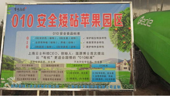 图:彭阳农户自发树立“010安全 据悉,目前010安全食品标准还是企业级标准,由云士智能科技(上海)有限公司于2015年提出。该公司成立于2014年底,由上海市科学技术一等奖第一完成人、上海市优秀技术带头人、海归博士温源创办。